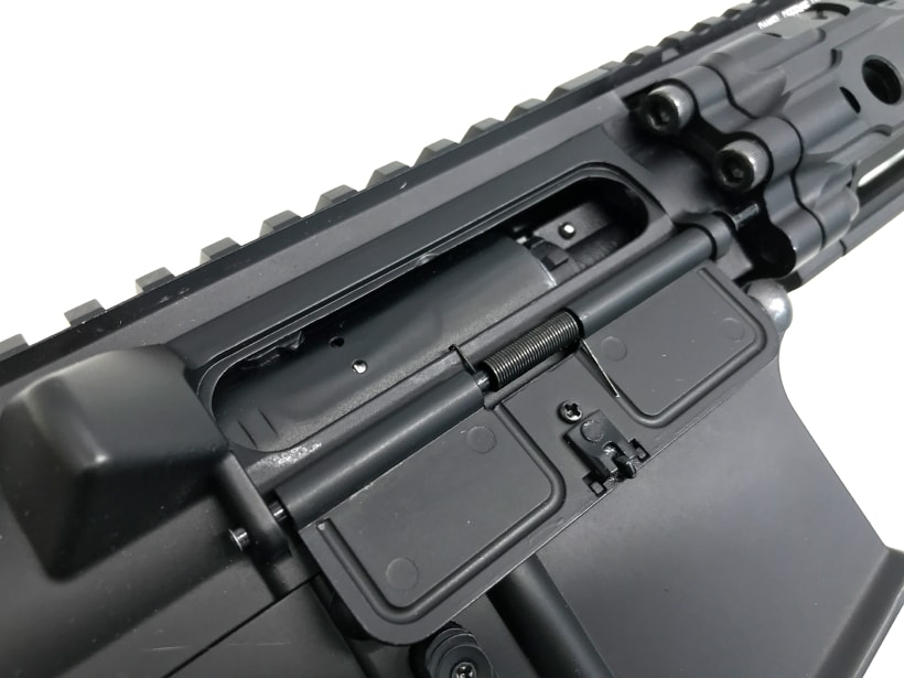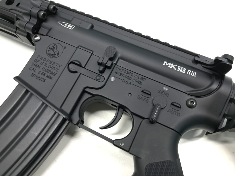 金属製のレシーバーにはCOLT刻印が施されており、同じく金属製のハンドガードはピカティニーレール付きで実銃同様拡張性抜群です。