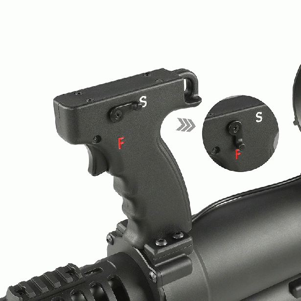 使用機やアパッチの操縦桿を思わせるガングリップには左右アンビのシンプルなセーフ/ファイアの安全装置、トリガーを装備。