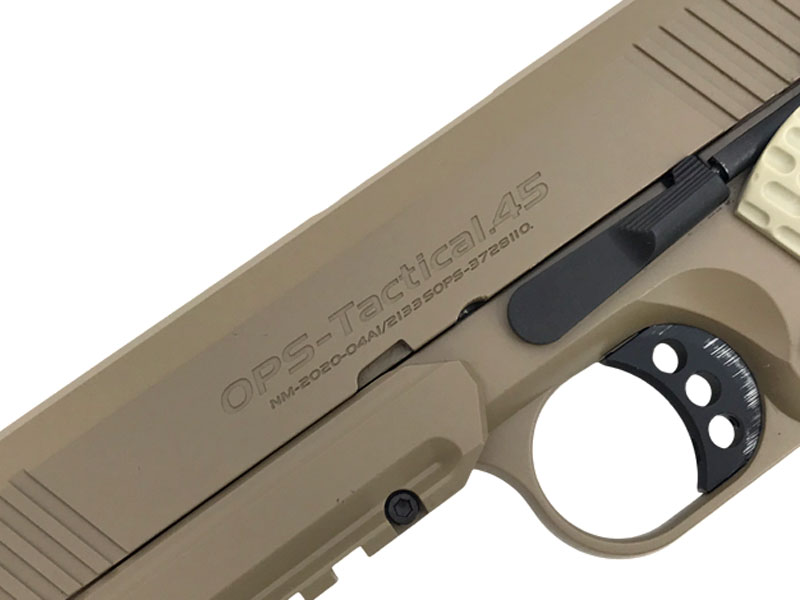 4.3インチスライドのコマンダーサイズに、ピカティニー規格(20mm幅)のアンダーレイルとダークオフグレーのガナーグリップを備え、デザートカラーを施した姿は「特殊作戦」を行うオペレーター達に随行するに相応しい雰囲気を漂わせたモデルとなっています。