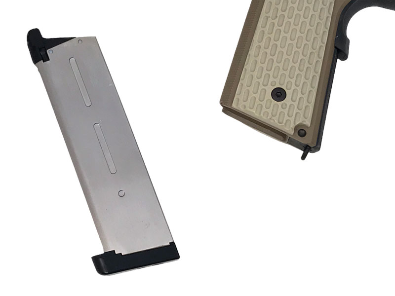 :ニッケルメッキが施された、装弾数28発のマガジンが付属。