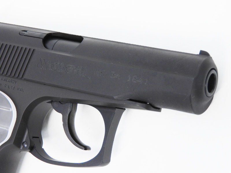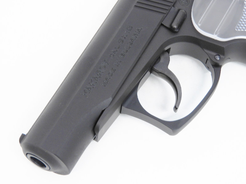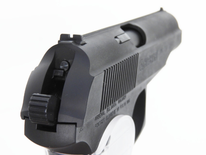 賑やかな輸出用刻印が施されたブルガリア生産型モデルで、握りやすさとマグチェンジを助けるフィンガーレスト付きマガジンや、角形トリガーガードなどのディテールを金属部品により再現しています。