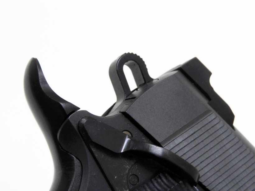 リアサイト前方部は深くえぐり込まれコッキングショルダーの機能も兼ねており、スライド上部を逆手に握って操作する際に有効なフォルムを備えており実践的です。
