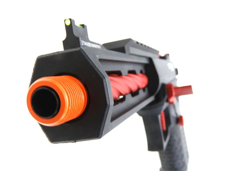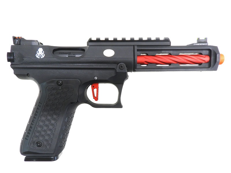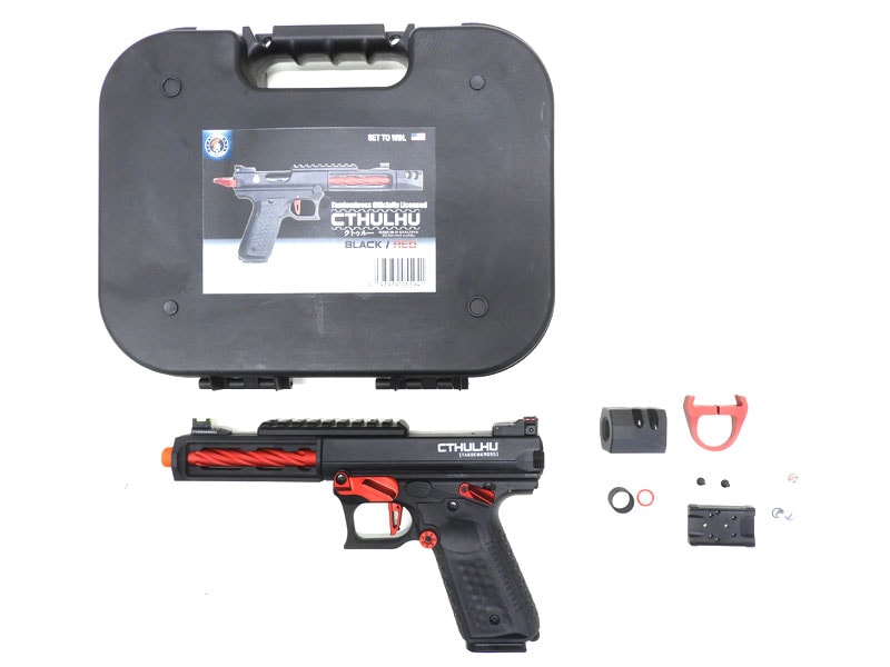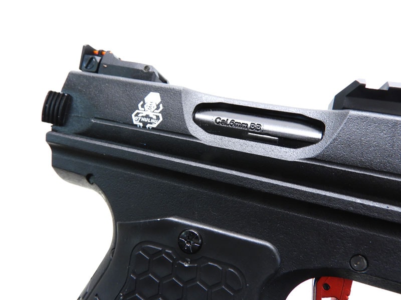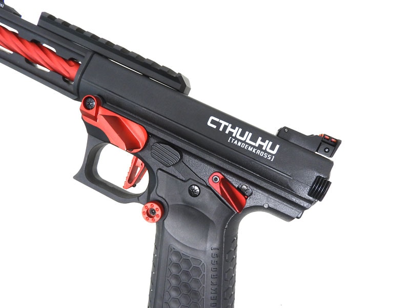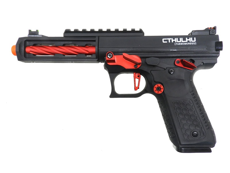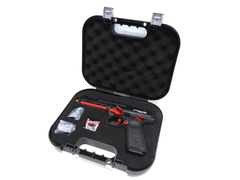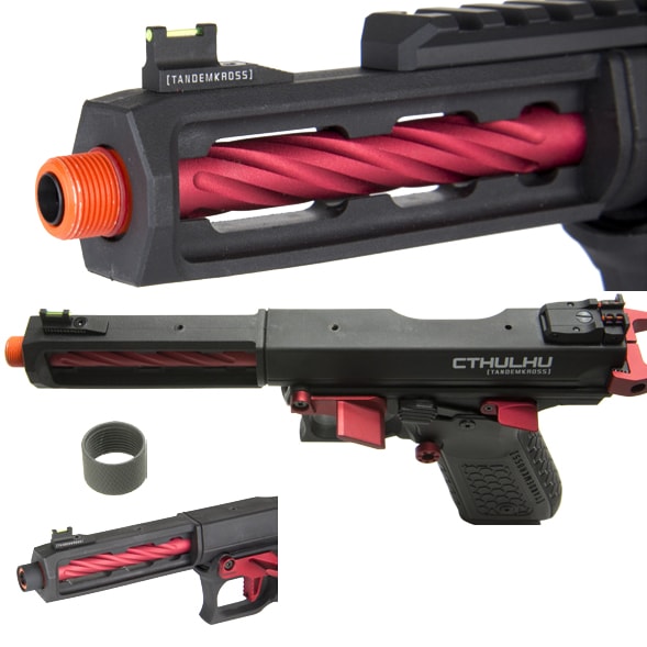 ルガーMk4 22口径ピストルをモデルにしたカスタムモデル。Cthulhu(クトゥルー)をイメージしたようなスパイラルフルート形状の深い赤色のアウターバレルが特徴的。