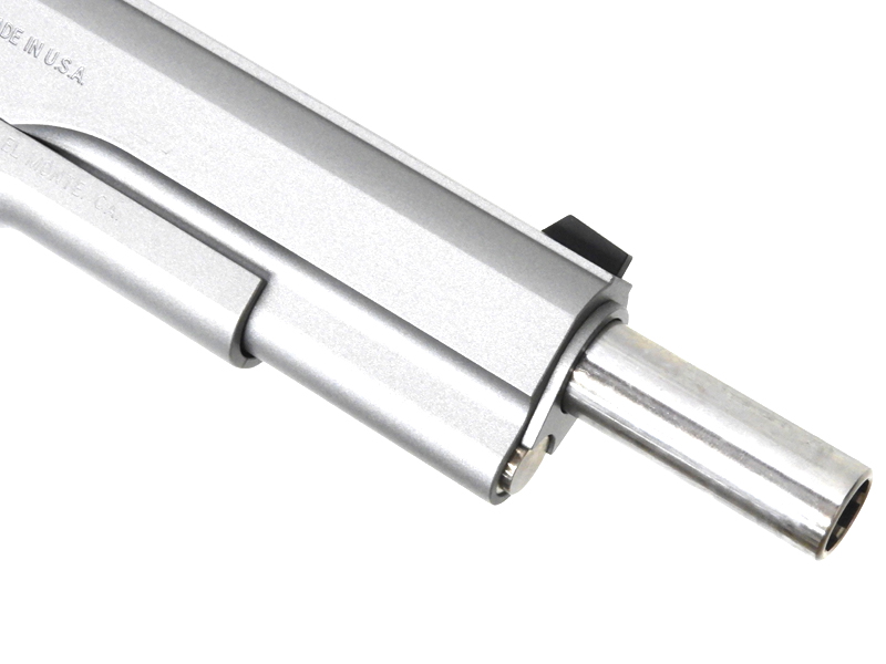 コルト社に先駆けてステンレス材を採用したことに加え、7インチというロングサイズのバレル &スライドを搭載したその姿は、斬新でいて唯一のもの。09モデルになり実銃と同じくしっかりとAMTと刻印されている。