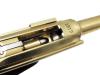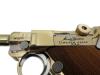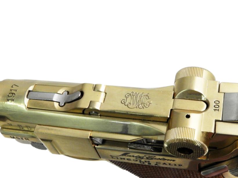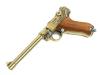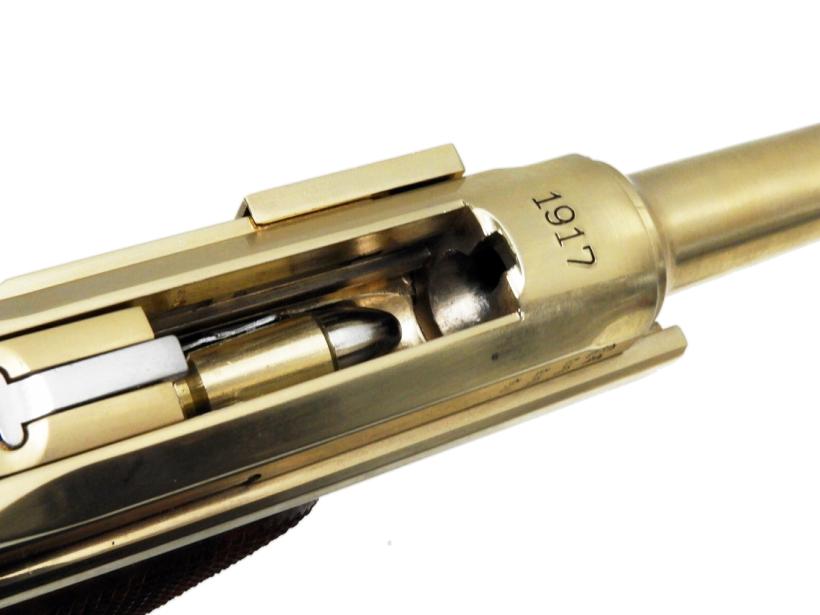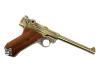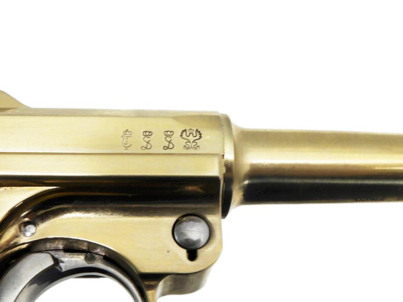 ダミーカートリッジを装填/排莢し楽しむダミーカートリッジ金属モデルガン。磨き上げられた亜鉛製にボディに91.7%が純金でできたゴールドコーティング「22KGP」を施した見た目にも美しいモデルガン。実物通りに分解できるほど忠実に再現された構造、細やかな刻印、ショートリコイルしてから起き上がるトグルアクションなど極限までリアルさを追求したモデルガンである。