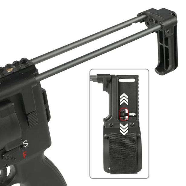 さらに、伸縮式のワイヤーストックを追加し、肩当てを利用した安定した射撃姿勢が取れます。