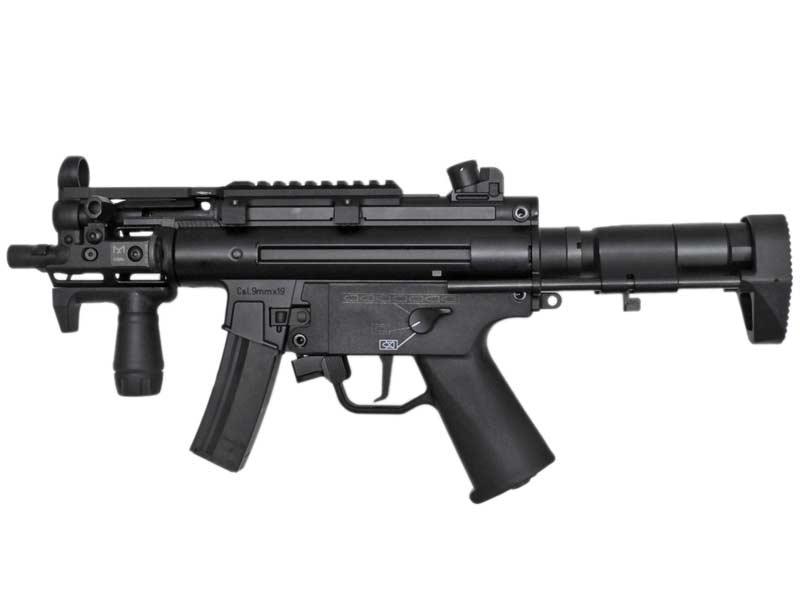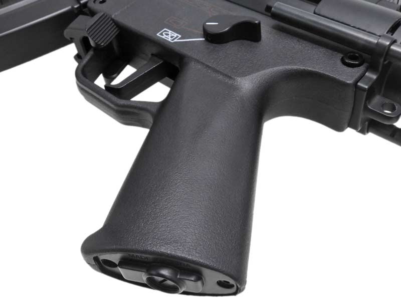 MP5K PDWをベースに各種アップデートを施したモデル。MP5シリーズが名銃と称され続ける理由の一つは、時代に合わせた進化を遂げてきた点にある。しかし、開発から半世紀以上が経過し、標準仕様では汎用性に限界が見られるようになった。そこで、近年はカスタムパーツを活用したモダナイズが進んでいる。このモデルでは従来のフォアグリップをM-LOKメタルハンドガードに交換し、トップレールも延長。これにより拡張性が飛躍的に向上している。マガジンキャッチやコッキングレバー、ストレートトリガーなど、操作系パーツも新たなデザインに変更され、より直感的な操作が可能だ。