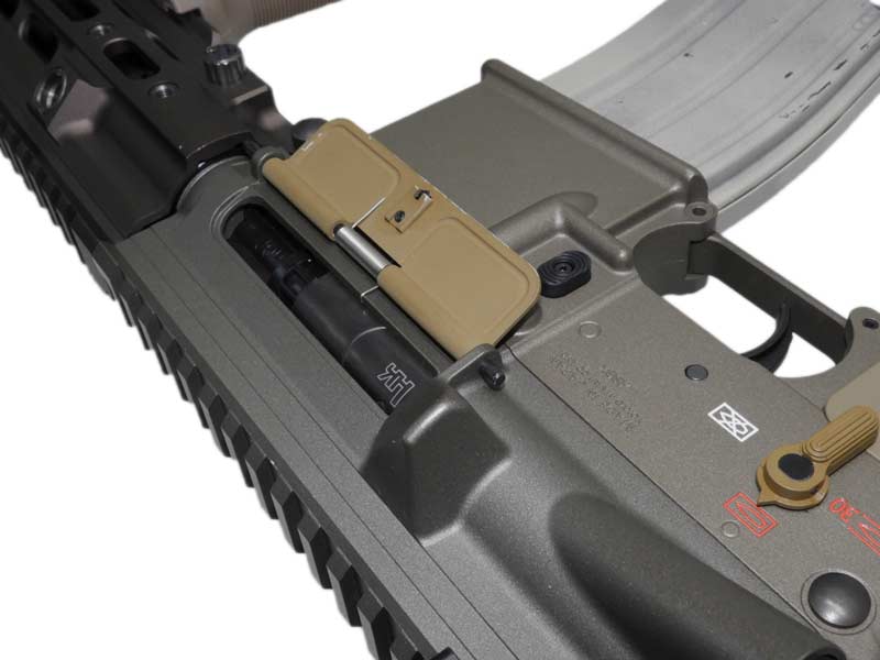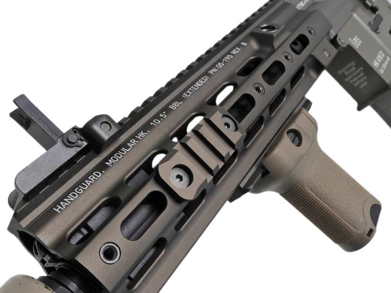 ハンドガードは、レイル脱着式のSMR HKタイプを採用。レイルの設置を必要最小限にすることで、ハンドガード部のスリム化や軽量化を実現しています。アディショナルレイルはロング1枚とショート2枚の計3枚が付属。また、本物を採寸することでディテールの再現性も高めています。