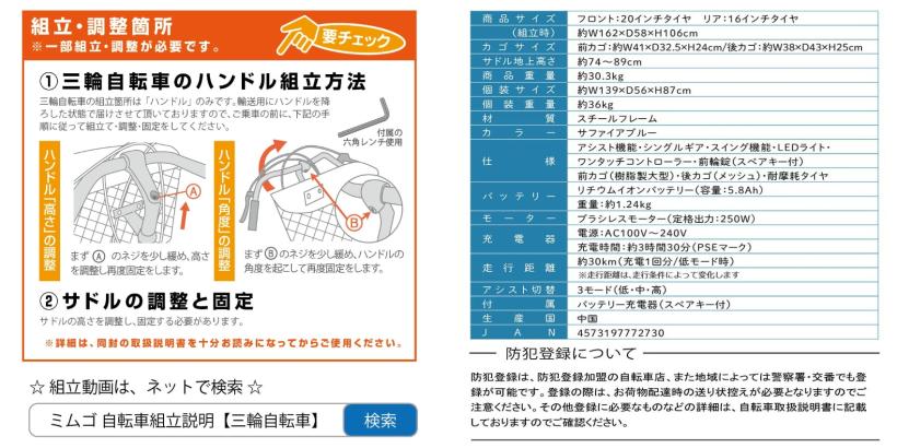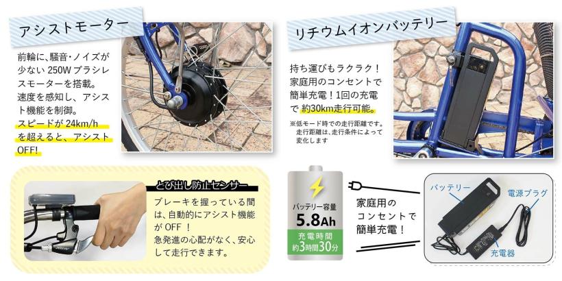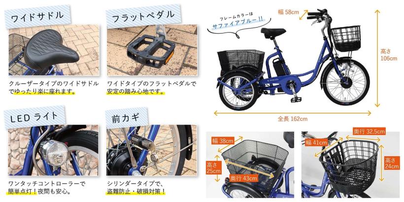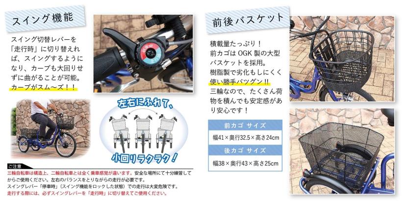 ■仕様:アシスト機能・シングルギア・スイング機能・ワンタッチコントローラー・LEDライト・前カゴ(樹脂製大型)・後カゴ(メッシュ)・前輪錠(スペアキー付)・耐摩耗タイヤ