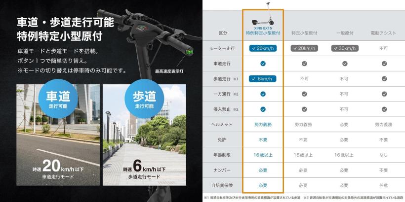 16歳以上なら免許不要で車道・歩道の走行が可能な「特例特定小型原付」となります。車道モードと歩道モードをボタンで切り替え可能。