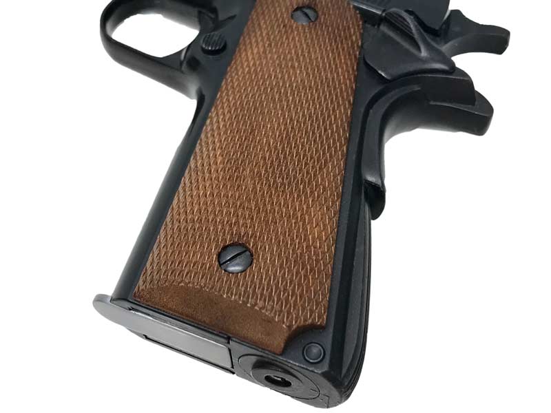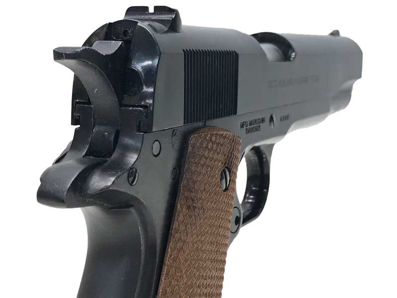 BB弾を使用するリキッドチャージ式のライブカートガスガンで、モデルガンのリアリティとガスガンのお手軽さを兼ね備えた一品。フレームは前後に分割され、前方はABS製、後方はグリップセーフティを含めた亜鉛合金の一体成型。後方フレーム内部にガスタンクを搭載し、リアルなプレス製マガジンを使用する。トリガーは発射とブローバックで2段階に分かれ、空撃ちだけでも楽しめる。
