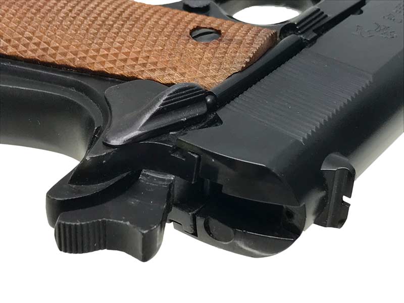 スライドの刻印はシリーズ70発売前の「プレ70」を再現。1954〜70年にかけてのコルト社製品は、古き良きアメリカンクラフトマンシップが息づいた繊細な仕上げが特徴。70年代以降はコスト削減で簡略化されたが、プレ70モデルはハンドメイドの丁寧な仕上げが施され、コレクター間で高値で取引されることもあるモデルである。
