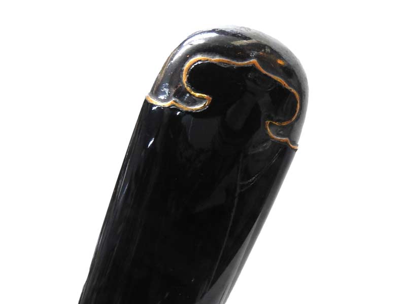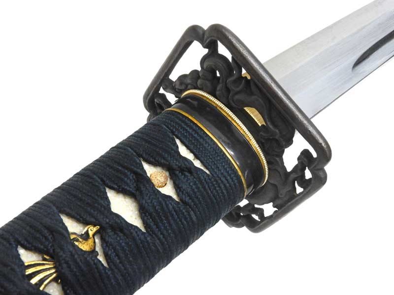 目貫は金に輝く鳳凰で頭と縁の装具は金と黒のコントラストが映える一振りであり豪華絢爛ながらも奢りすぎない引き締まったひとふりとなっている。