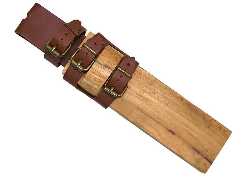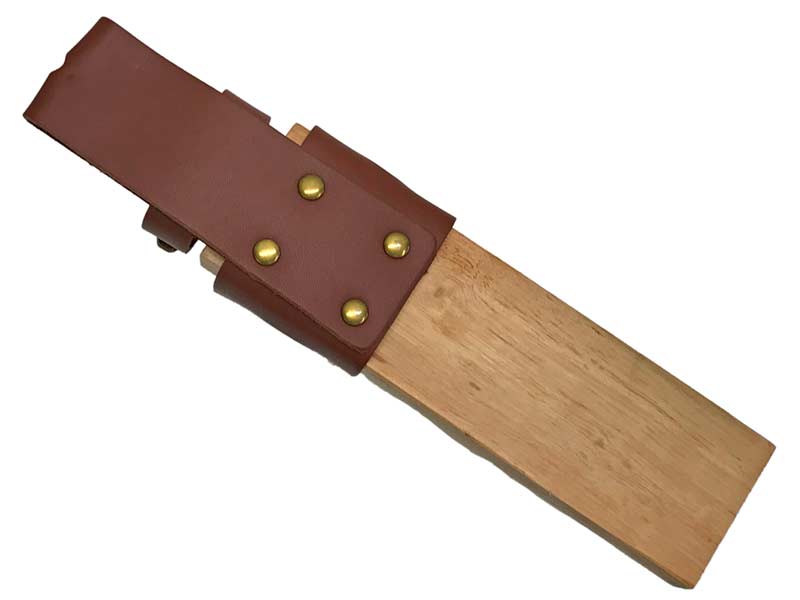 抜き差しがしやすい木ザヤ仕様。ベルト通し可能な革製留め具付き。