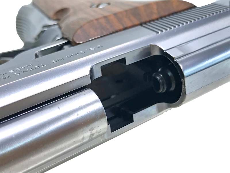 スライドやフレーム、各部パーツにクロームメッキを施し、ステンレスシルバーの美しさを再現するとともに耐擦過性能も格段にアップ。激しいホルスターアクションにも耐えうる硬度をもっています。