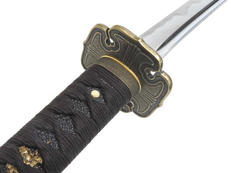 目貫は金に輝く武者図で頭と縁の装具は金の無地で無骨な仕上がり。