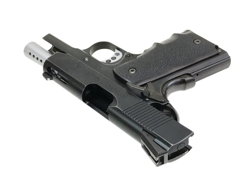 V10を象徴するカスタムスライドには上面左右2箇所のスリットが機械加工で再現されており、スライド閉鎖時にバレルのVポートが覗くことでメカニカルな造形美を堪能できる。
