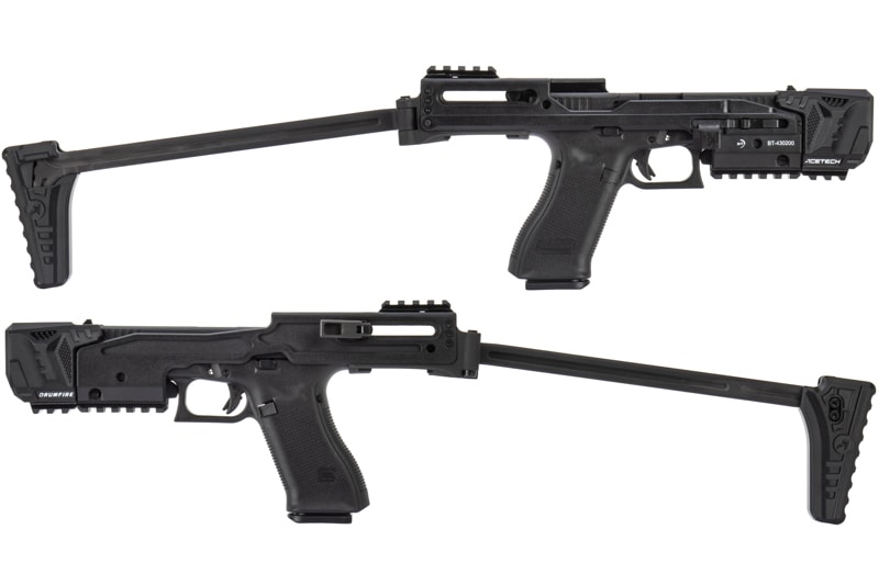 このコンバージョンキットをリアルに再現したARCHWICK製レプリカに [ BATON airsoft ] GLOCK G17 Gen.5 MOS CO2GBBが収納出来るよう加工を施し、ACETECHによる専用設計のマズルフラッシュトレーサー『Drumfire』をセットしたのが本製品である。