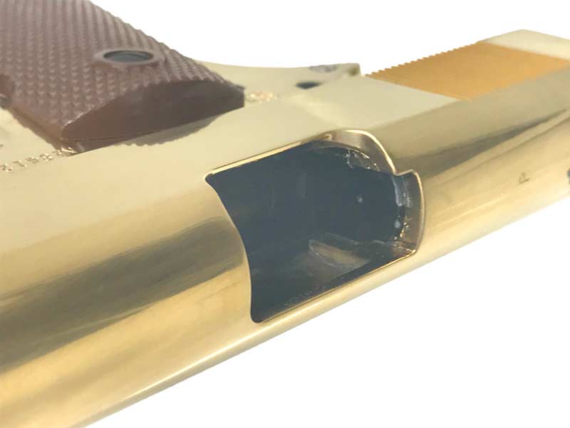 1キロを超える圧倒的重量感を誇る。観賞用のためスライドバックはしてもマガジンは抜けず、「タニオアクション」と呼ばれる、トリガーを引くとスライドが後退するシステムを採用。