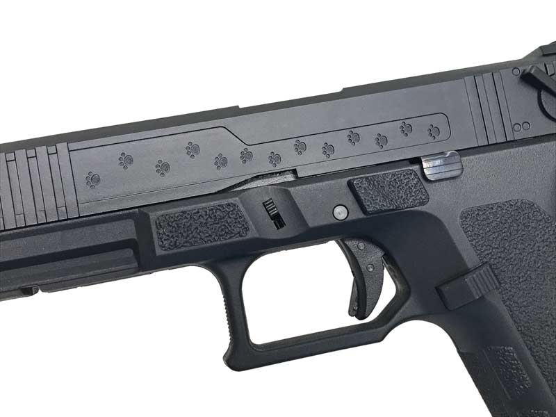 ★ スライドの天面と両側面に、これでもかという数の肉球を刻印。ワンポイントにスライド天面後方にサカナ(骨仕様)を刻印しています