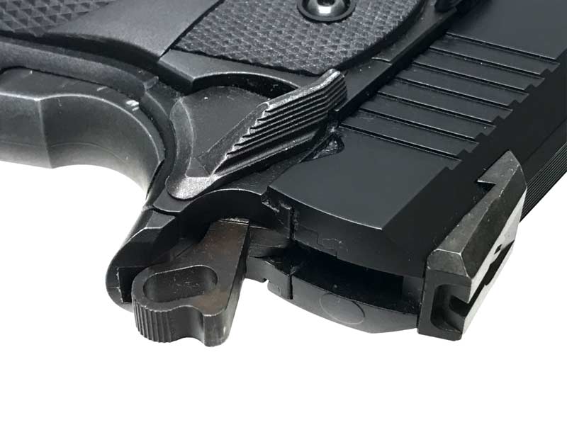 4.3インチのコンパクトな銃身が取り回しやすく、ショートセフティやショートマガジンがホルスターからの抜きやすさにも一役買っている。ブローバックは軽快に動作しジャムも無く確実に動作する。