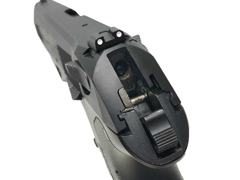 スライドが後退する際にバレルが回転するシステムを搭載。またセフティを操作すると、本物のファイアリング・ピンを模した六角穴付きボルトが連動して作動します。