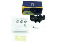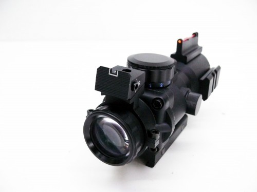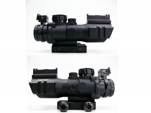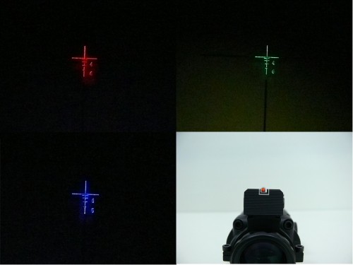 SUNIPERの固定倍率スコープ。レティクルは赤・緑・青でそれぞれ3段階調光可能。対物レンズ側面にはピカティニーレール付き。上部には蓄光タイプのサイトも搭載。