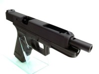 グロックのストレートフレームはあまり見慣れないため握りにくそうに見えるが、実際握るととても素直にグリップすることが出来る。フレームもスライドもHWのモデルなのでかなりの重みと硬質感を感じられる。実銃同様にチャンバー側から一回りずつ大きくなっていくコンペンセイテッドバレルのポートは、機械切削によりカチッとエッジが立っており味わい深い。