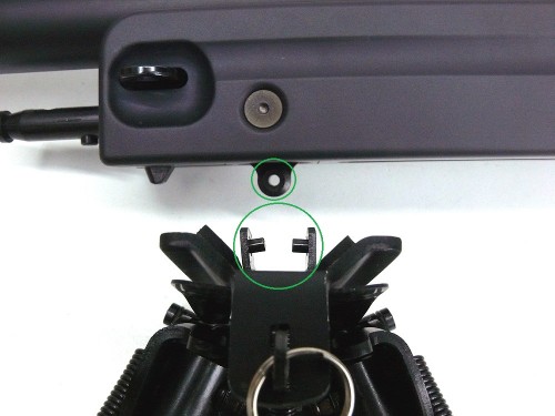 [NB] ハリスタイプ M3バイポッド 6インチ レイルアダプタ付 スイング機能付 (中古) 製品詳細画像3 VSRやL96などのライフルはスイベルスタッドに突起をはめてネジを締めれば装着完了。(モデルにより加工が必要な場合があります。)