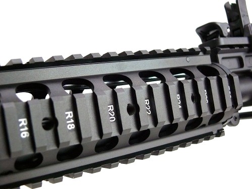 レイルハンドガードはRIS。仕上がりが良いのでこのままでもオススメですが、バレルナットが実銃と同じ構造なので対応するフリーフローティングRASなどに換装することも出来ます。