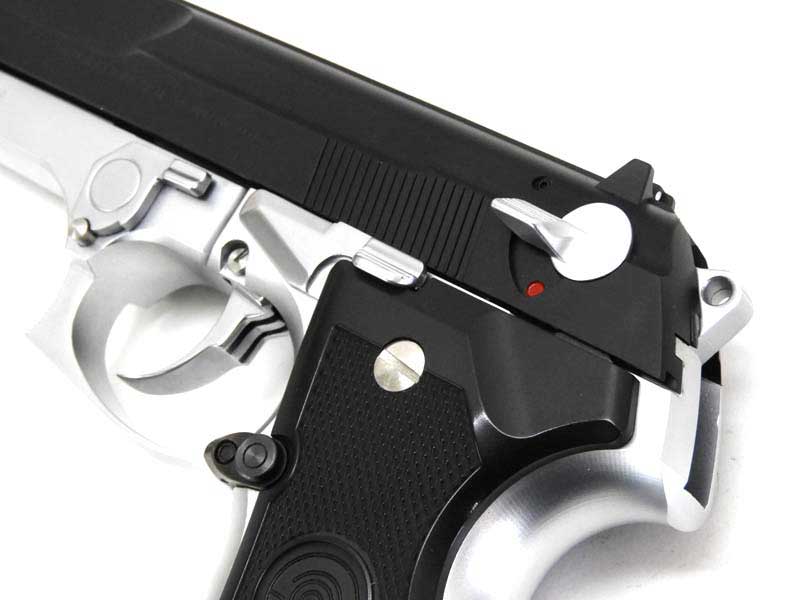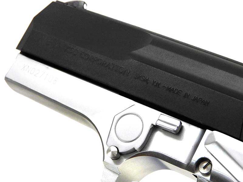 外観などの好みはともかく、ベレッタファンなら進化を俯瞰するうえで是非とも手にとってほしい一丁です。ブラックとシルバーの重厚なツートーンカラーのボディは高級感も同時にまとっており、触ってよし、飾ってよし、撃ってよし、いかなる用途でも満足の逸品です。 なお、なるべくロゴを隠して成型を行うことで有名なKSCの商品としては珍しく、スライド左前方側に「KSC CORPORATION」のロゴが入っています。気になる方は気になるかもしれません。