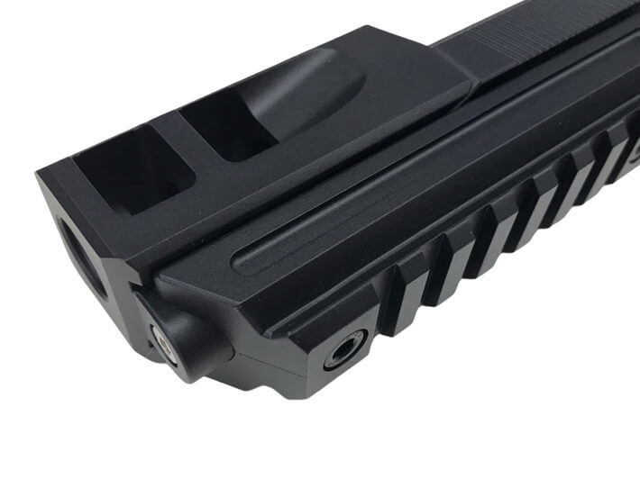 ・銃口の跳ね上がりを抑える《大型スタビライザー》には、バランスを考慮した軽量化のための溝を追加。また、フラッシュライト等の装着を可能にする20mm幅(ピカティニー規格)の《アンダーレイル》が一体化。