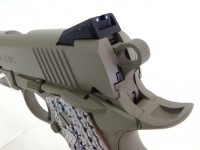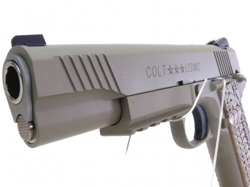 ボリュームを増したピカティニレールには金属製の別部品を採用することでヘビーな重量感を再現し、スライドとフレームに施された独特なマーキングは、彫刻機を用いてシャープに再現。G10の模様をイメージした鮮やかなグリップには、45ACP弾のリムで回せるよう工夫されたラージヘッド・グリップスクリューを使用。フレームには海兵隊の要望通り、トリガーガード下部にアンダーカット加工が施されている。そして、ヘビーウエイト樹脂製のスライド、フレームおよび各部パーツには、Cerakote社のタン・カラーコーティングをイメージした焼付塗装が施され、均一な質感をもった美しい仕上げの製品となっている。