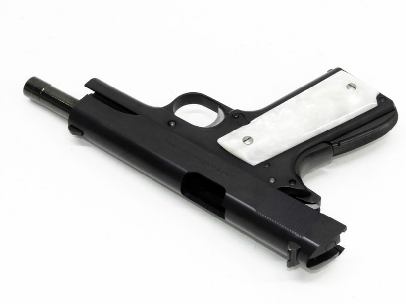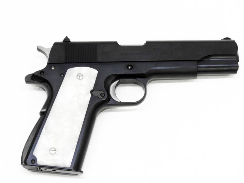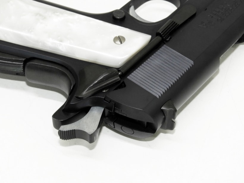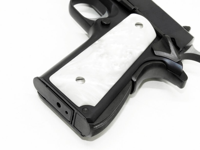 [WA] コルトガバメント マーク シリーズ70 DX ガンブルー ガスブローバック (中古) 製品参考画像4 実銃用グリップメーカーAJAX社製のホワイトパールライトグリップを標準装備。