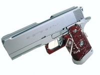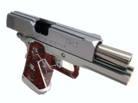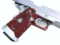 群を抜く作動感や、独自のサイティングシステムIIOSが好評のTikiハイキャパシティモデルを、スライドサイズに合わせてグリップ部分もコンパクト化。手作業で丹念にステッピング作業が行われたのち、一丁一丁グリップ部分へハンドペイントされたスプラッシュモデル。