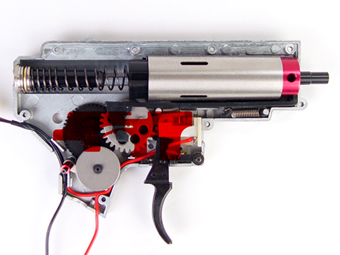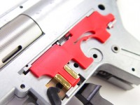 電動ガンのセレクター部分と連動しセミ、フル、セフティの切り替えを行うセレクタープレートを自己潤滑性・耐熱性に優れた素材を使用する事でセレクターチェンジをスムーズにし、そしてスプリングピンの形状変更によりピンの耐久性も向上しています。
