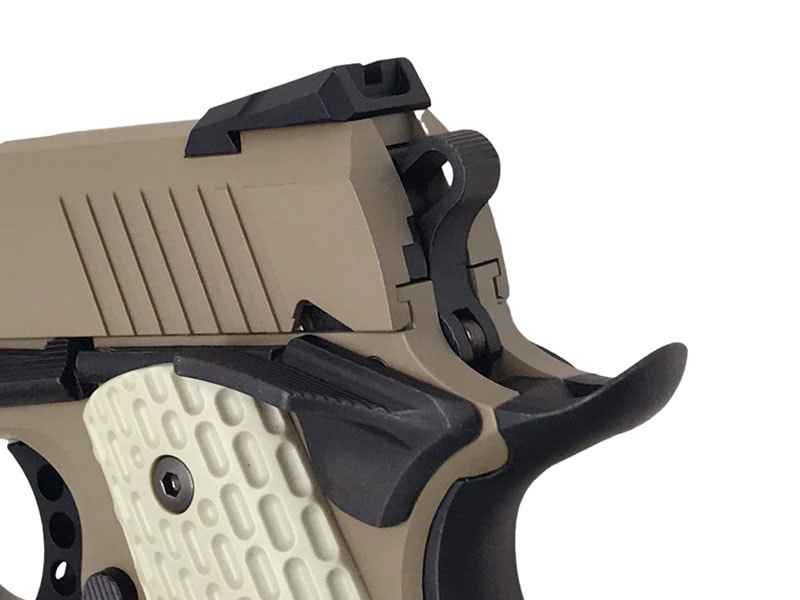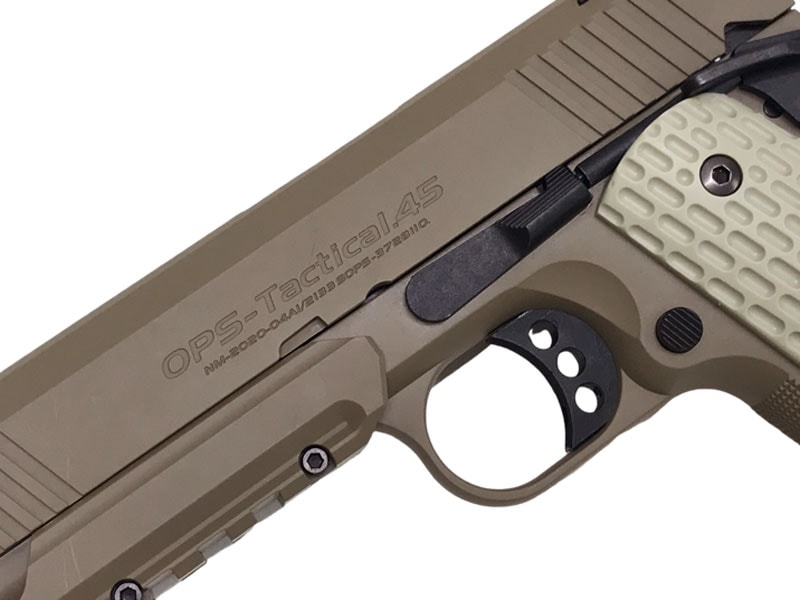4.3インチスライドのコマンダーサイズに、ピカティニー規格(20mm幅)のアンダーレイルとダークオフグレーのガナーグリップを備え、デザートカラーを施した姿は「特殊作戦」を行うオペレーター達に随行するに相応しい雰囲気を漂わせたモデルとなっています。