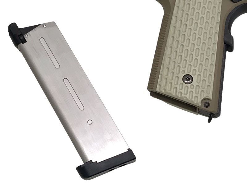 :ニッケルメッキが施された、装弾数28発のマガジンが付属。