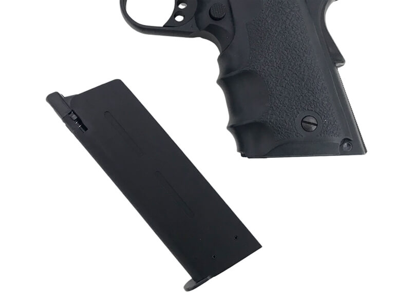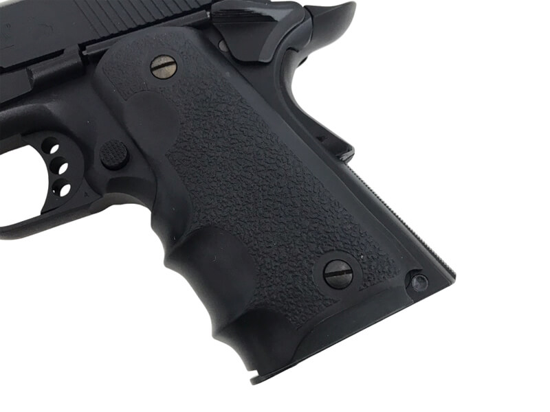 ホーグ製を模したフィンガーチャネルグリップになっていてしっかりホールドできるようになっている。 コンパクトサイズはバレルとスライドが短い為にリコイルが強くなり、コントロールし難くなるが、テーパードコーンバレルを採用する事によって銃前方のウエイトが増し、リコイルを軽減出来る。リアサイトはノバックタイプで視認性もよい。