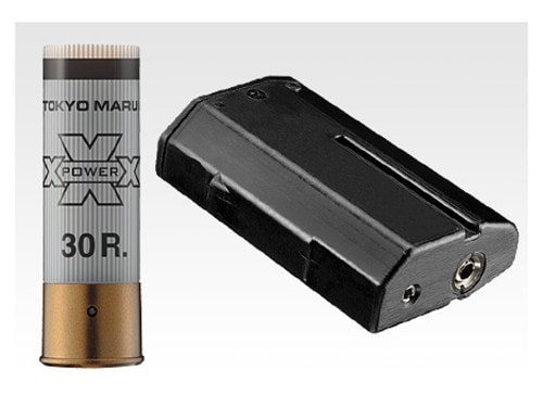 脱着可能なガスタンク:冷えに強いダイカスト製のガスタンクをストック内に収納。脱着式で交換も簡単です。ショットシェル型マガジン:装弾数30発、実物ショットシェルを模したマガジンが付属します。※エアーショットガン用ショットシェル型マガジンも全て使用可能です。