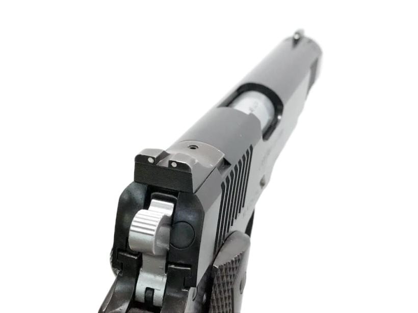 スライドには大きくセレーションが入っており、滑りにくい。5mm軸タイプの片側セフティやリアルサイズトリガー、ラバーコーティング・ダイキャストグリップが特徴的。