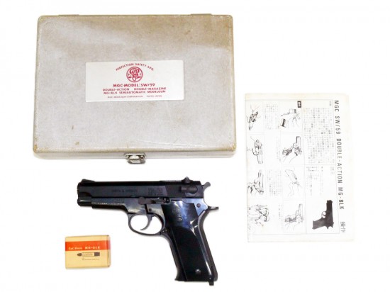 1954年に発売された同社初(アメリカ初)のダブルアクション式オートマチックピストルで、その後の自動拳銃シリーズの基本となったM39。そのM39のダブルアクション、ダブルカラムマガジンタイプのM59。ABS製、オープンカートリッジ対応モデル。カートリッジ1箱(20発)付属。