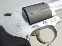 市場で最も人気のあるJ-フレームのなかで、軽量・強度が売りのM360。その中で最軽量・高級ラインがSC/PDモデルになります。実銃の特徴であるマットシルバー・ボディとチタニウム・シリンダーを、高品質塗料セラコートで再現。サイドプレートには21個の電子が浮遊する“21 Electrons”マークをはじめ、多数のレーザー刻印を施しました。ケースハードン色仕上げのトリガー/ハンマーを標準装備した贅沢な1丁です。少量生産品。モデルガンに続きペガサス式ガスガンで登場!!