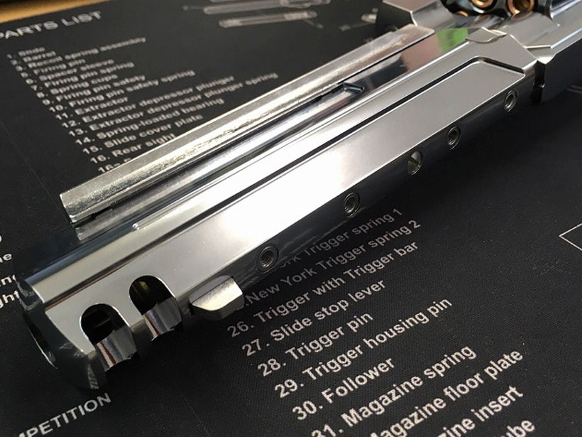 上下のマウントレールは20mm幅となっており、ダットサイト、スコープ、フラッシュライト等の装備を追加可能。装備を付けなくとも、ゴツゴツとした形状のマウントレール、銃身、先端部に開けられたコンペンセイターが独自の雰囲気を醸し出す。さらに上下のマウントレールを取り外せば、スリムな銃身のカスタムガンとして楽しめる。