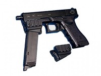 グロッグのフレームに両側から挟みこんでボルトで締めるだけの簡単構造で、前方に予備マガジンが差しこめ、さらにこれをフォアグリップとして使用できるスグレモノ。