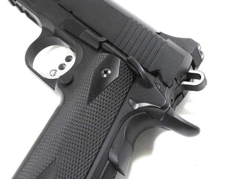 フィクスドタイプのリアサイト/ビーバーテイルグリップセフティ/ロングリコイルスプリングガイド/3ホールトリガー…とカスタムパーツをフル搭載。米ロス市警オーダーのSWATモデルのスペックを反映させた、信頼の一丁です。
