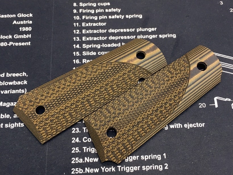 最高品質のG10素材を使用したガバメントシリーズ用フルサイズグリップ。グリーン/ブラックカラー。
