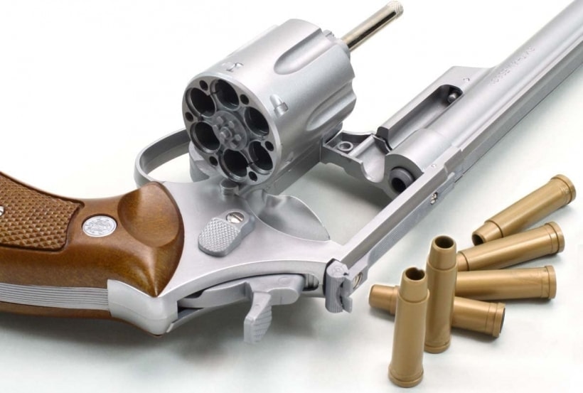 クラウンモデル製 S&W M629 エアコッキングガン。カートリッジにBB弾を装填し、シリンダーにカートリッジを装填し発射。10才以上用。